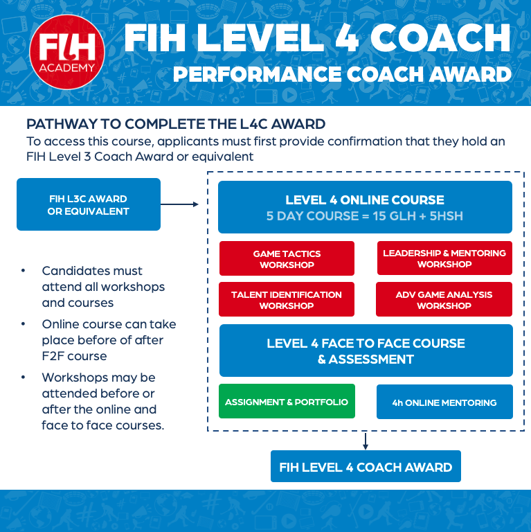 The FIH Level 1 and 2 are available online or in person. The Level 3 and 4 Courses involve a blend of online and face to face components.